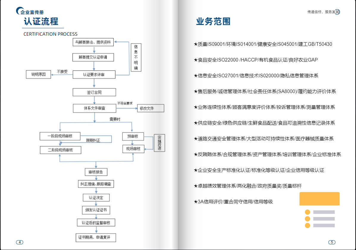 作为一个独立、公正和专业的认证机构,我们致力于推动认证事业的规范化、标准化、专业化。我公司认证将以诚信、务实为根基,以 传递信任、服务发展 为己任,不断开拓创新,增加新的认证服务领域,以建立一个合作共赢的技术服务平台,为推动我国认证事业的积极健康发展奉献一份绵薄之力!